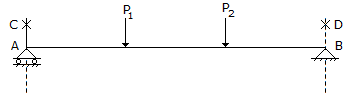 End A of the beam AB shown in the figure is on rollers and end B is hinged. C and D are the points on normals drawn at A and B to the beam at A and B respectively. To determine for reactions, funicular polygon must start at