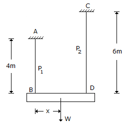 A gradually applied load W is suspended by with ropes AB and CD as shown in the figure. The wires AB and CD, made of the same material and of the same cross-section are connected to a rigid block from which the load W is suspended in such a way that both the ropes stretch by the same amount. If the stress in AB and CD are p1 and p2 respectively, then the ratio - will be